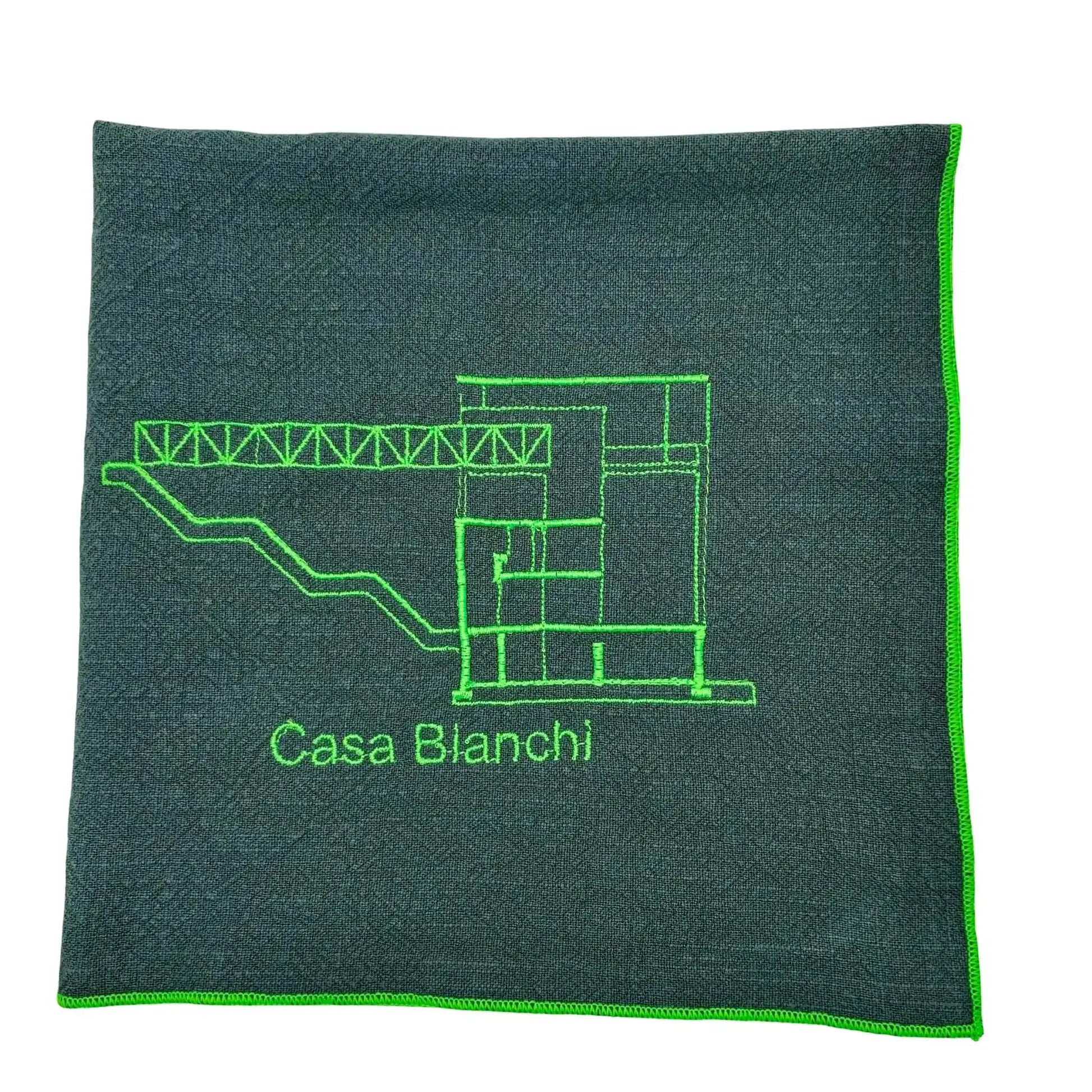 Serviette en lin lavé brodée de plans de projets d'architecture emblématiques.